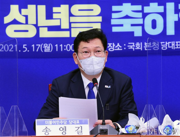 [서울=뉴스핌] 이형석 기자 = 송영길 더불어민주당 대표가 17일 국회에서 열린 성년의날 기념 20대 청년 초청간담회에서 인사말을 하고 있다. 2021.05.17 leehs@newspim.com