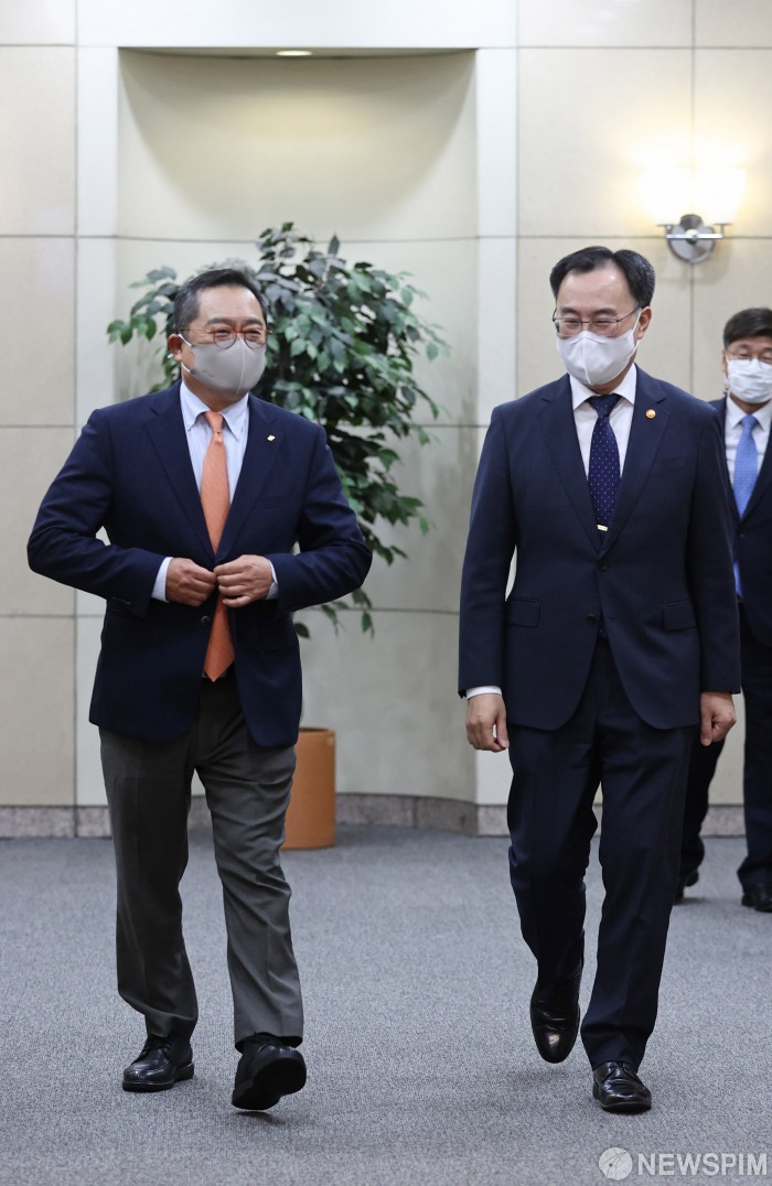 [서울=뉴스핌] 윤창빈 기자 = 문승욱 산업부 장관과 구자열 한국무역협회 회장이 27일 오전 서울 강남구 트레이드타워 한국무역협회에서 만나 회의실로 걸어가고 있다. 2021.05.27 pangbin@newspim.com