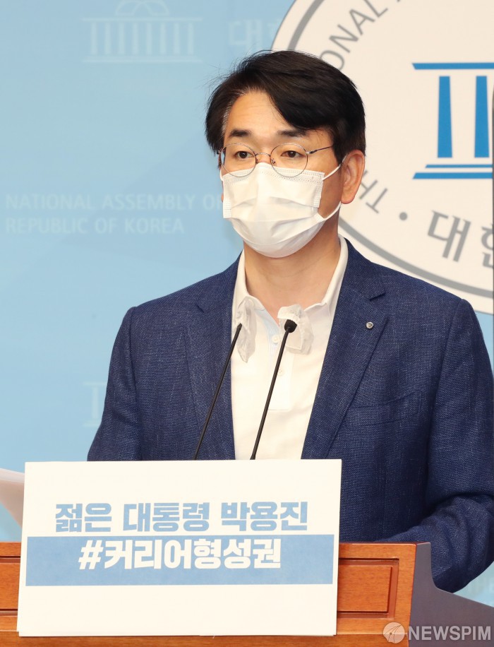 [서울=뉴스핌] 최상수 기자 = 대선출마를 선언한 더불어민주당 박용진 의원이 27일 서울 여의도 국회 소통관에서 '커리어형성권' 대선 공약 관련 기자회견을 하고 있다. 2021.05.27 kilroy023@newspim.com