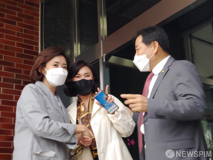 [동해=뉴스핌] 이형섭 기자 = 국민의힘 당대표 본경선에 도전한 나경원 전 의원이 29일 이철규 국회의원 지역구인 강원 동해시를 방문했다. 이철규 국회의원 사무실 앞에서 지지자와 기념사진을 찍고 있다.2021.05.29 onemoregive@newspim.com