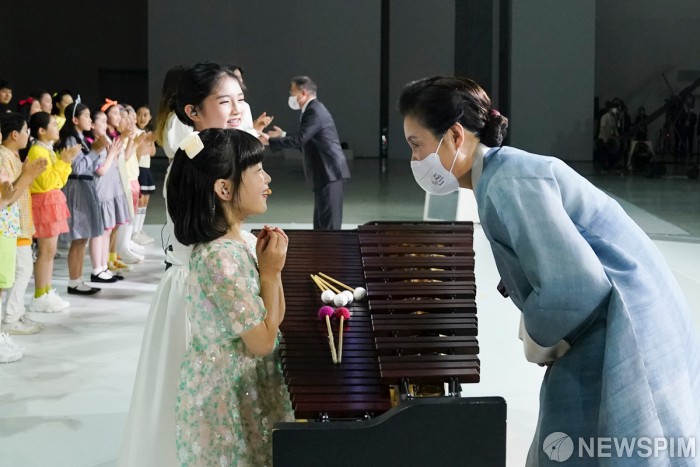 [서울=뉴스핌] 김정숙 여사가 30일 오후 서울 동대문디자인플라자(DDP)에서 열린 '2021 P4G 서울 녹색미래 정상회의' 개회식을 마치고 공연 및 출연진과 인사하고 있다.. [사진=청와대 ] 2021.5.30 photo@newspim.