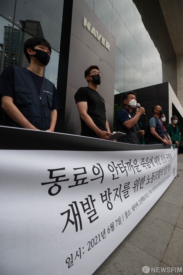 [성남=뉴스핌] 윤창빈 기자 = 신환섭 민주노총 화섬식품노조 네이버지회 위원장이 7일 오전 경기 성남시 네이버본사 앞에서 열린 ‘동료의 안타까운 죽음에 대한 진상규명과 재발방지를 위한 노동조합의 입장 발표’ 기자회견에서 모두발언을 하고 있다. 2021.06.07 pangbin@newspim.com
