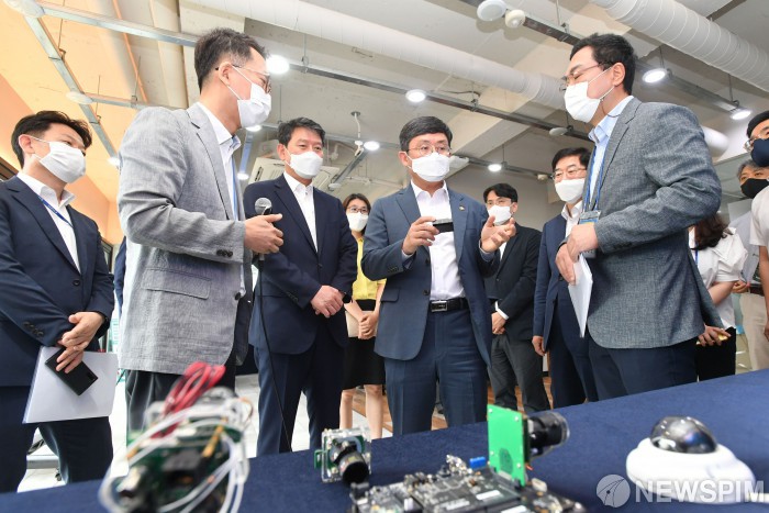 [서울=뉴스핌]안도걸 기획재정부 차관이 16일 광주광역시 소재 인공지능 창업캠프를 방문,관계자의 설명을 들으며 AI창업캠프를 둘러보고 있다.[사진= 기획재정부 ] 2021.06.16photo@newspim.