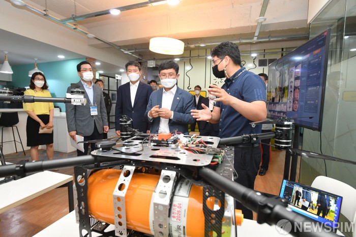 [서울=뉴스핌]안도걸 기획재정부 차관이 16일 광주광역시 소재 인공지능 창업캠프를 방문,관계자의 설명을 들으며 AI창업캠프를 둘러보고 있다.[사진= 기획재정부 ] 2021.06.16photo@newspim.