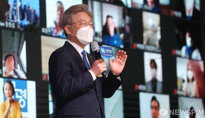 [서울=뉴스핌] 최상수 기자 = 22일 여의도 글래드호텔에서 이재명 경기지사 지지자 15만여명이 발기인으로 참여하는 '공명포럼'출범식이 열린 가운데 이지사가 기조연설을 하고 있다. 2021.06.22 kilroy023@newspim.com