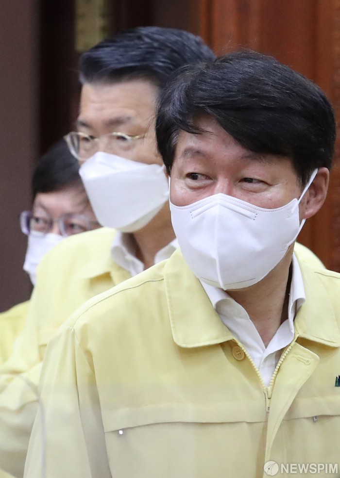 [서울=뉴스핌] 김학선 기자 = 안경덕 고용노동부 장관(오른쪽부터), 은성수 금융위원장, 임서정 청와대 일자리수석이 24일 오전 서울 종로구 정부서울청사에서 열린 제39차 비상경제 중앙대책본부(중대본) 회의에 참석하고 있다. 2021.06.24 yooksa@newspim.com