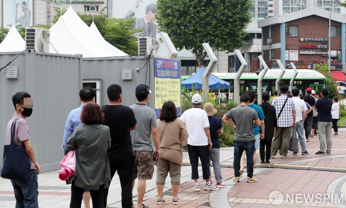 [서울=뉴스핌] 정일구 기자 = 신종 코로나바이러스 감염증(코로나19) 신규 확진자가 나흘 연속 600명대를 기록한 26일 서울 구로구 구로역 광장에 마련된 임시 선별검사소에서 시민들이 검사를 받기 위해 줄지어 서있다. 중앙방역대책본부는 이날 0시 기준 국내 신규 확진자가 668명이 늘어 15만4457명이라고 밝혔다. 2021.06.26 mironj19@newspim.com