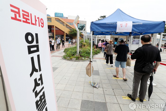 [서울=뉴스핌] 정일구 기자 = 신종 코로나바이러스 감염증(코로나19) 신규 확진자가 나흘 연속 600명대를 기록한 26일 서울 구로구 구로역 광장에 마련된 임시 선별검사소에서 시민들이 검사를 받기 위해 줄지어 서있다. 중앙방역대책본부는 이날 0시 기준 국내 신규 확진자가 668명이 늘어 15만4457명이라고 밝혔다. 2021.06.26 mironj19@newspim.com