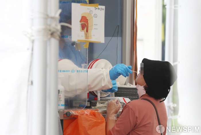 [서울=뉴스핌] 정일구 기자 = 신종 코로나바이러스 감염증(코로나19) 신규 확진자가 나흘 연속 600명대를 기록한 26일 서울 구로구 구로역 광장에 마련된 임시 선별검사소에서 의료진이 검체 체취를 하고 있다. 중앙방역대책본부는 이날 0시 기준 국내 신규 확진자가 668명이 늘어 15만4457명이라고 밝혔다. 2021.06.26 mironj19@newspim.com