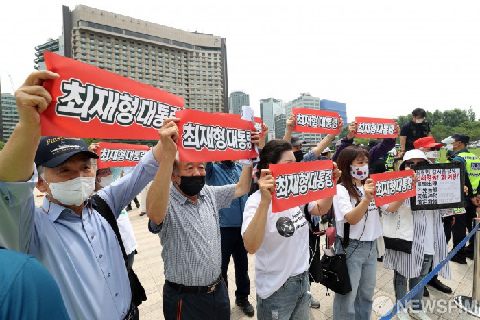 [서울=뉴스핌] 정일구 기자 = 최재형을 지지하는 국민모임 회원들이 5일 오후 서울 중구 서울시청 앞에서 열린 최재형 대선 출마 촉구 기자회견에서 피켓을 들고 있다. 2021.07.05 mironj19@newspim.com