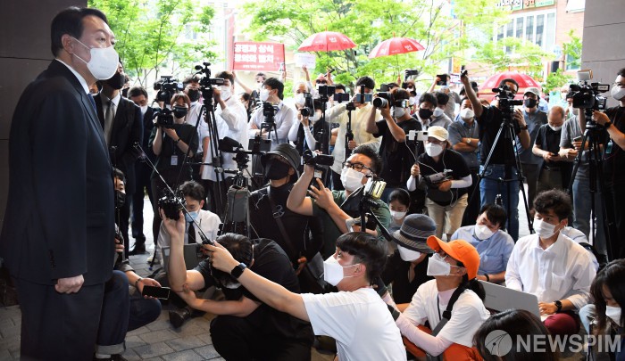 [서울=뉴스핌] 국회사진취재단 = 윤석열 전 검찰총장이 7일 오후 서울 종로구 한 중국식당에서 국민의당 안철수 대표와 오찬 회동을 마친 뒤 취재진의 질문에 답하고 있다. 2021.07.07 photo@newspim.com