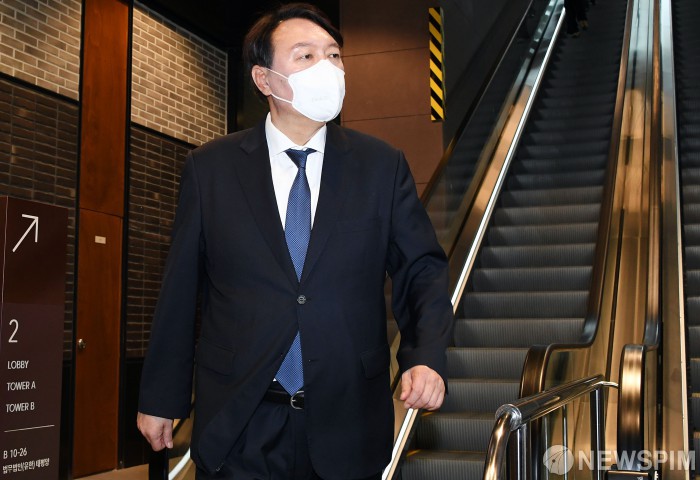 [서울=뉴스핌] 국회사진취재단 = 윤석열 전 검찰총장이 7일 오후 서울 종로구 한 중국식당에서 국민의당 안철수 대표와 오찬 회동을 마친 뒤 백 브리핑 장소로 이동하고 있다. 2021.07.07 photo@newspim.com