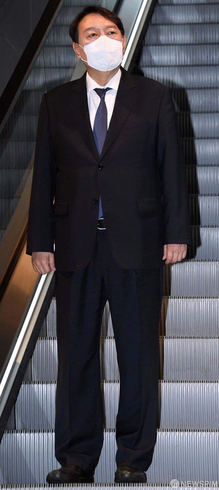 [서울=뉴스핌] 국회사진취재단 = 윤석열 전 검찰총장이 7일 오후 서울 종로구 한 중국식당에서 국민의당 안철수 대표와 오찬 회동을 마친 뒤 백 브리핑 장소로 이동하고 있다. 2021.07.07 photo@newspim.com