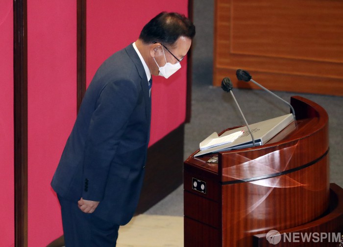 [서울=뉴스핌] 최상수 기자 = 김부겸 국무총리가 8일 오전 서울 여의도 국회에서 열린 본회의에서 2차 추경안 관련 정부 시정연설에 앞서 국민들에게 고개숙여 인사를 하고 있다. 2021.07.08 kilroy023@newspim.com