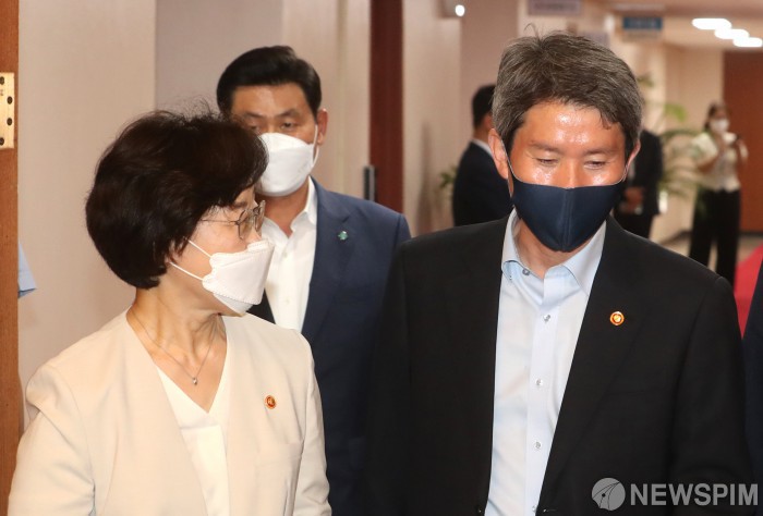 [서울=뉴스핌] 김학선 기자 = 이인영 통일부 장관과 정영애 여성가족부 장관이 13일 서울 종로구 정부서울청사에서 열린 국무회의에 참석하며 대화하고 있다. 2021.07.13 yooksa@newspim.com