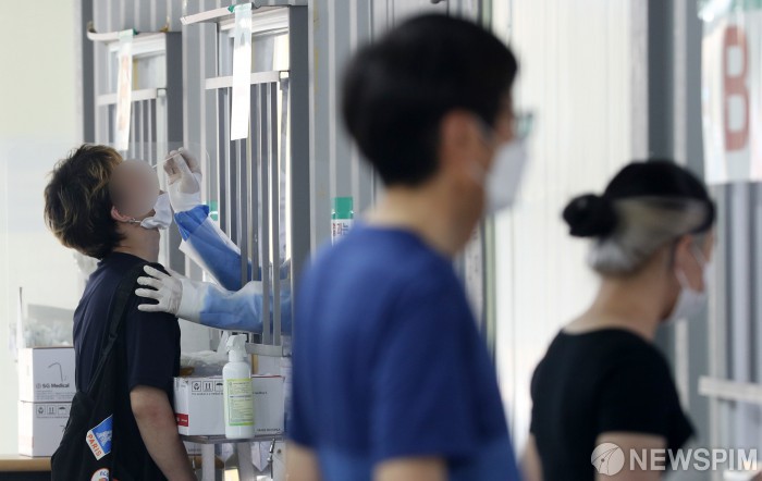 [서울=뉴스핌] 정일구 기자 = 신종 코로나바이러스 감염증(코로나19) '4차 대유행'으로 신규 확진자가 1주일째 1000명대를 기록한 13일 서울 성북구 성북천 바람마당에 마련된 임시 선별검사소에서 시민들이 폭염 속에 검사를 받고 있다. 2021.07.13 mironj19@newspim.com