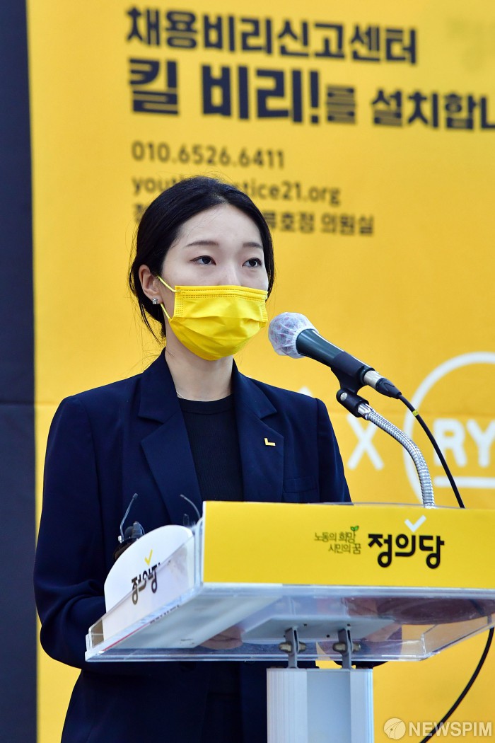 [서울=뉴스핌] 이형석 기자 = 강민진 청년정의당 대표가 21일 국회에서 열린 청년정의당 채용비리신고센터 '킬비리' 설립 기자회견에서 발언을 하고 있다. 2021.07.21 leehs@newspim.com