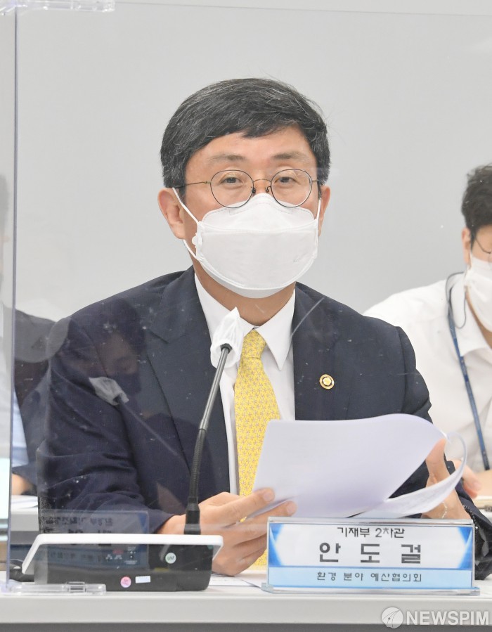 [오송=뉴스핌] 안도걸 기획재정부 차관이 7월 27일 충북 오송 소재 온실가스종합정보센터에서 열린 '환경 분야 예산협의회'에서 모두발언을 하고 있다. [사진=기획재정부] 2021.07.27 photo@newspim.com