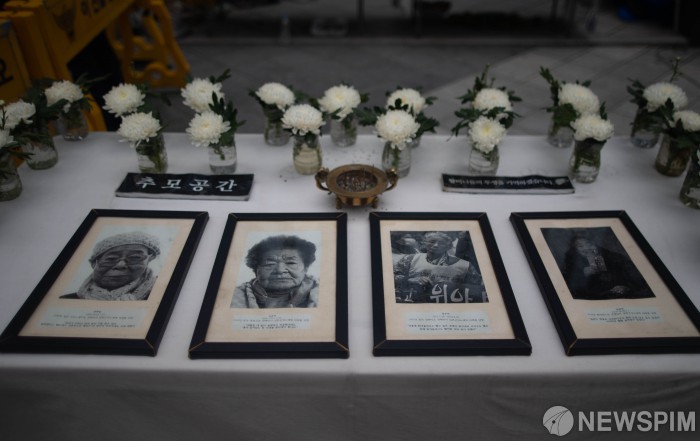 [서울=뉴스핌] 윤창빈 기자 = 4일 오후 서울 종로구 옛 일본대사관 앞에서 열린 제1503차 일본군성노예제 문제해결을 위한 정기 수요시위 기자회견에서 돌아가신 할머니들을 추모하는 공간이 마련되어 있다. 2021.08.04 pangbin@newspim.com