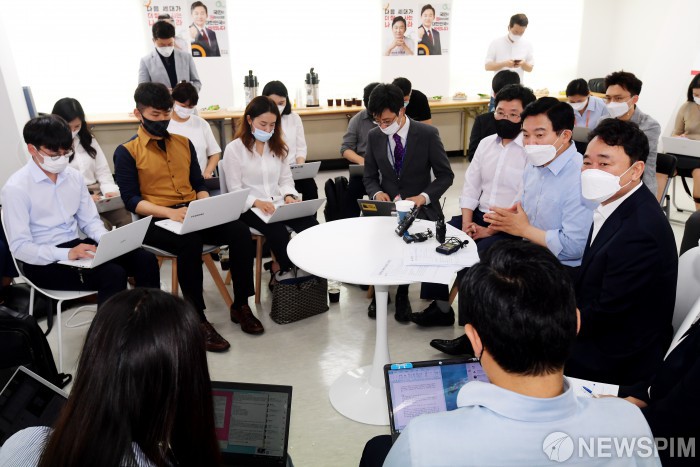[서울=뉴스핌] 국회사진취재단 = 국민의힘 대선 예비후보인 원희룡 전 제주지사가 12일 오후 서울 영등포구 용산빌딩에 위치한 캠프 사무실에서 '원희룡의 원팀캠프 데이' 기자간담회를 갖고 취재진의 질문에 답하고 있다. 2021.08.12 photo@newspim.com