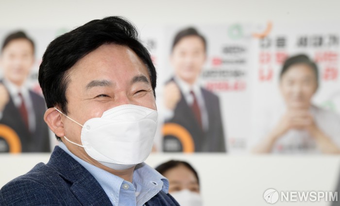 [서울=뉴스핌] 국회사진취재단 = 국민의힘 대선 예비후보인 원희룡 전 제주지사가 12일 오후 서울 영등포구 용산빌딩에 위치한 캠프 사무실에서 '원희룡의 원팀캠프 데이' 기자간담회를 갖고 취재진의 질문을 들으며 웃고 있다. 2021.08.12 photo@newspim.com