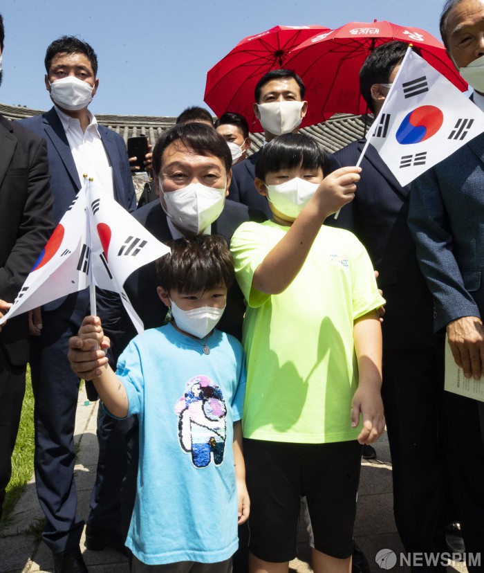 [서울=뉴스핌] 정일구 기자 = 제76주년 광복절인 15일 서울 용산구 효창공원을 찾은 윤석열 국민의힘 대선 예비후보가 어린이들과 기념촬영을 하고 있다. 2021.08.15 mironj19@newspim.com