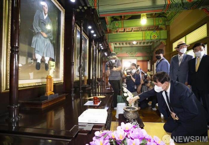 [서울=뉴스핌] 정일구 기자 = 제76주년 광복절인 15일 서울 용산구 효창공원을 찾은 윤석열 국민의힘 대선 예비후보가 효창공원 내 의열사를 참배하고 있다. 2021.08.15 mironj19@newspim.com