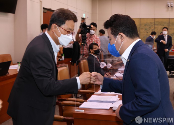[서울=뉴스핌] 최상수 기자 = 국회 문화체육관광위원회 전체회의가 17일 국회에서 열린 가운데 이달곤 야당 간사와 박정 여당 간사가 인사를 하고 있다. 이날 회의에서는 언론사의 고의와 중과실에 따른 허위 조작 보도에 최대 5배까지 손해배상 청구를 허용하도록 하는 언론중재법 개정안 심의가 진행됐다. 2021.08.17 kilroy023@newspim.com