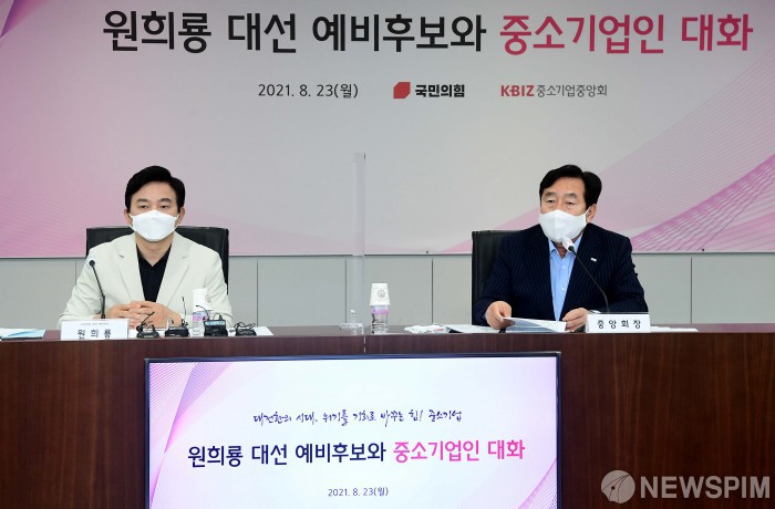 [서울=뉴스핌] 이형석 기자 = 김기문 중소기업중앙회장이 23일 서울 여의도 중소기업중앙회에서 대·중소기업 양극화 실태와 중소기업 현안 과제를 주제로 열린 ‘원희룡 국민의힘 대선 예비후보와 중소기업인 대화’에서 인사말을 하고 있다. 2021.08.23 leehs@newspim.com