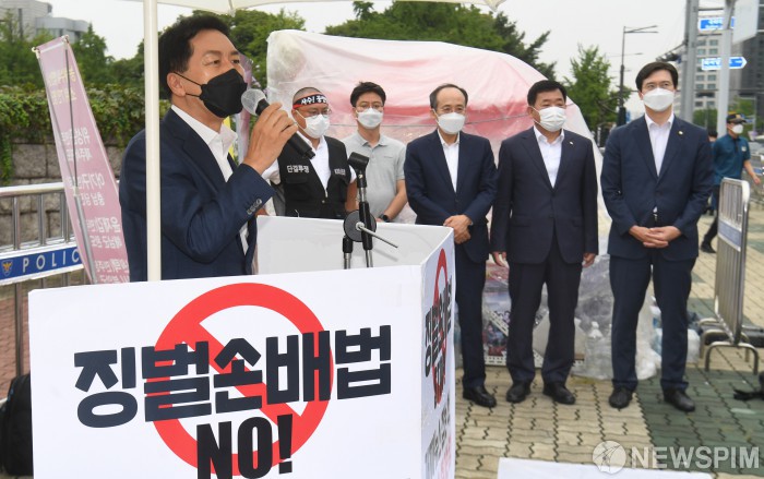 [서울=뉴스핌] 최상수 기자 = 국민의힘 김기현 원내대표가 25일 서울 여의도 국회 정문 앞에서 '언론독재법과 반민주 악법 끝장 투쟁 범국민 필리버스터'에서 발언하고 있다. 2021.08.25 kilroy023@newspim.com