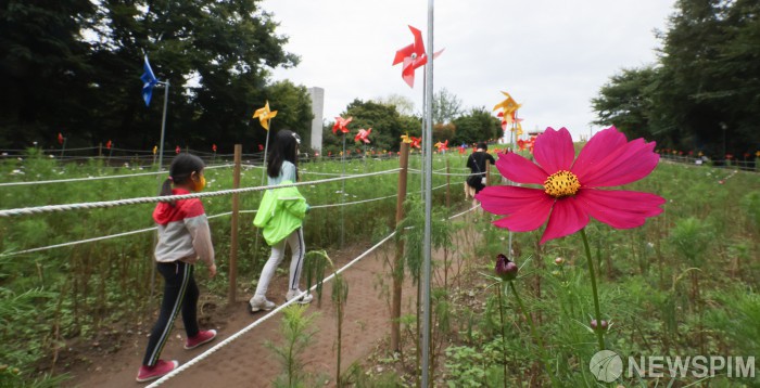 [서울=뉴스핌] 최상수 기자 = 절기상 추분이 이틀 지난 25일 오후 서울 송파구 올림픽공원 들꽃마루 코스모스 화원에 바람개비들이 놓여있다. 2021.09.25 kilroy023@newspim.com