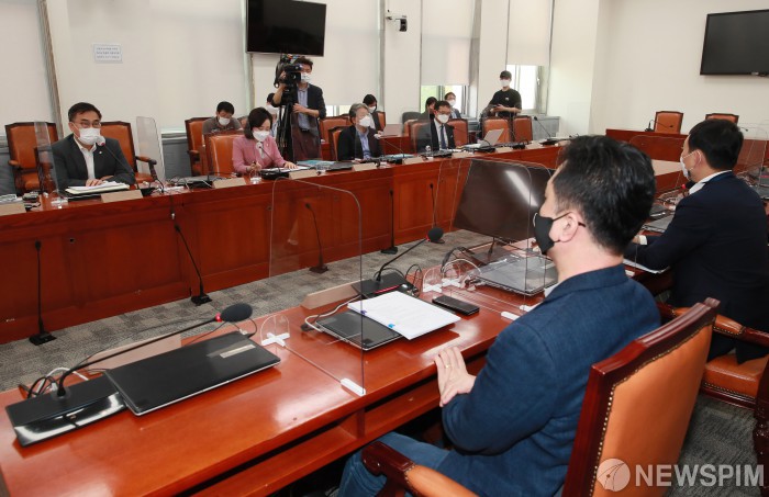 [서울=뉴스핌] 윤창빈 기자 = 언론중재법 8인 협의체 회의가 26일 오후 서울 여의도 국회에서 열린 가운데 최형두 국민의힘 의원이 대화를 하고 있다. 2021.09.26 pangbin@newspim.com