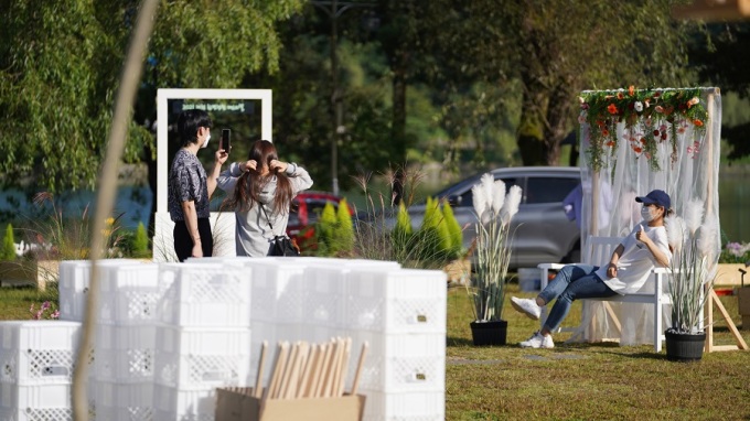 | [제천=뉴스핌] 백운학 기자 =3일 충북 제천 의림지 수변무대 일원에서 열리는 '제천 한평정원 페스티벌'을 찾은 시민들이 기념촬영을 하며 즐거운 시간을 보내고 있다. '이웃들의 마음과 마음을 잇는 생활 속 이야기정원'이라는 주제로 펼쳐지는 이 행사는 시민들의 아이디어 공모를 통해 접수 된 다양한 작품 82작품이 전시되고 있다.[사진=제천시] 2021.10.03 baek3413@newspim.com |