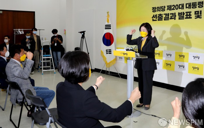 [서울=뉴스핌] 최상수 기자 = 12일 오후 국회에서 열린 정의당 제20대 대통령선거 후보자 선출결과 발표 및 보고대회에서 대선 후보자로 선출된 심상정 의원이 구호를 외치고 있다. 2021.10.12 kilroy023@newspim.com