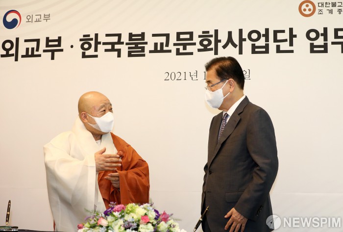 [서울=뉴스핌] 정일구 기자 = 정의용 외교부 장관(오른쪽)과 조계종 총무원장 원행스님이 13일 오전 서울 용산구 외교부 장관 공관에서 열린 외교부-한국불교문화사업단 업무협약식을 마치고 대화를 나누고 있다. 2021.10.13 mironj19@newspim.com