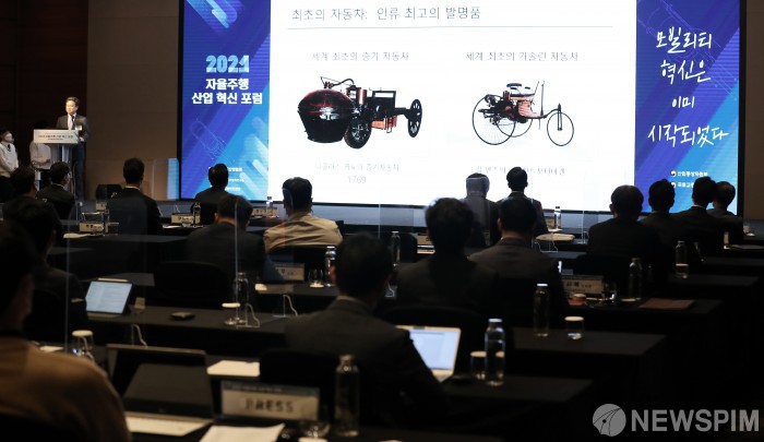 [서울=뉴스핌] 정일구 기자 = 서승우 서울대 전기전자공학부 교수가 13일 오후 서울 여의도 콘래드호텔에서 열린 한국자율주행산업협회 창립식에서 자율주행 기술 혁신과 모빌리티 패러다임 전환을 주제로 기조강연을 하고 있다. 2021.10.13 mironj19@newspim.com