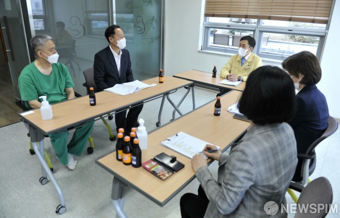 [서울=뉴스핌]양성일 보건복지부 제1차관이 15일 오후 충북 청주시 소재 해피맘 산후조리원을 방문해 코로나19 방역 관리 사항을 점검하고 현장의 애로사항을 청취하고 있다.[사진= 보건복지부 ] 2021.10.15 photo@newspim.com