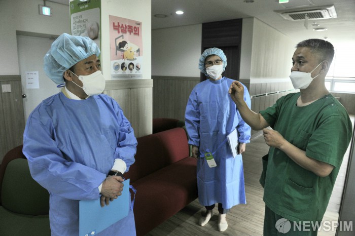 [서울=뉴스핌]양성일 보건복지부 제1차관이 15일 오후 충북 청주시 소재 해피맘 산후조리원을 방문해 코로나19 방역 관리 사항을 점검하고 현장의 애로사항을 청취하고 있다.[사진= 보건복지부 ] 2021.10.15 photo@newspim.com