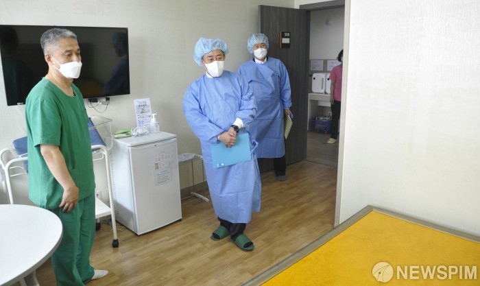 [서울=뉴스핌]양성일 보건복지부 제1차관이 15일 오후 충북 청주시 소재 해피맘 산후조리원을 방문해 코로나19 방역 관리 사항을 점검하고 현장의 애로사항을 청취하고 있다.[사진= 보건복지부 ] 2021.10.15 photo@newspim.com