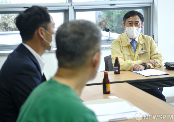 [서울=뉴스핌]양성일 보건복지부 제1차관이 15일 오후 충북 청주시 소재 해피맘 산후조리원을 방문해 코로나19 방역 관리 사항을 점검하고 현장의 애로사항을 청취하고 있다.[사진= 보건복지부 ] 2021.10.15 photo@newspim.com