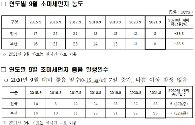 [부산=뉴스핌] 남동현 기자 = 부산시는 지난 9월의 부산시 초미세먼지 월평균 농도가 8㎍/㎥로 2015년 이후 초미세먼지 관측 이래 가장 낮았다고 밝혔다.