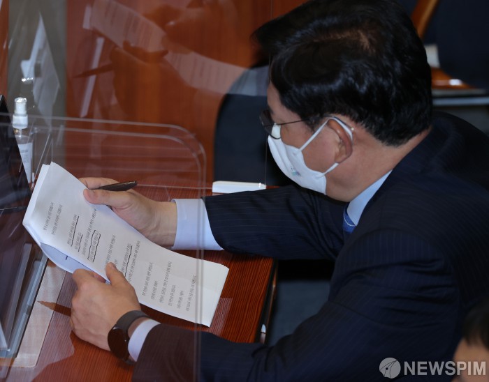 [서울=뉴스핌] 이형석 기자 = 문재인 대통령이 25일 서울 여의도 국회 본회의에서 2022년 예산안에 대한 시정연설을 진행한 가운데 송영길 더불어민주당 대표가 연설문을 살펴보고 있다. 2021.10.25 leehs@newspim.com