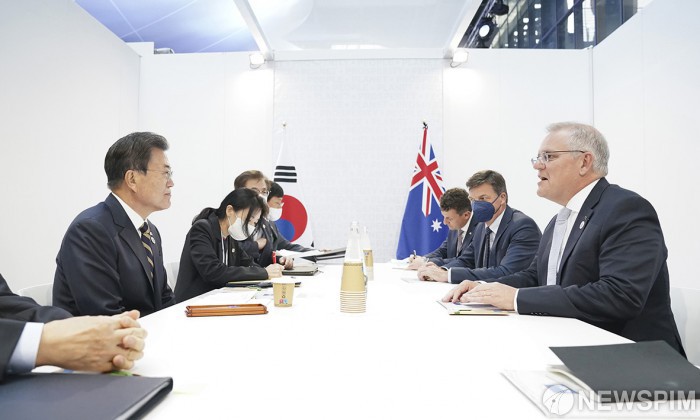 [서울=뉴스핌] G20(주요 20개국) 정상회의 참석차 이탈리아 로마를 방문 중인 문재인 대통령이 31일(현지시간) 누볼라 컨벤션센터 양자회담장에서 스콧 모리슨 호주 총리와 정상회담을 하고 있다. [사진=청와대] 2021.11.01 photo@newspim.com