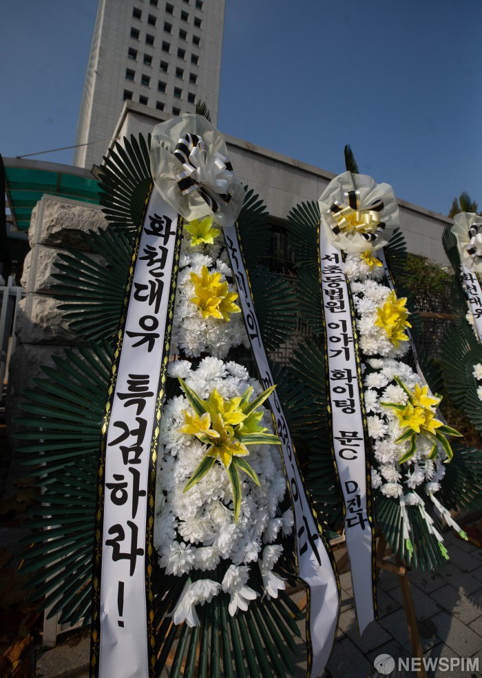 [서울=뉴스핌] 윤창빈 기자 = 2일 오전 서울 서초구 대검찰청 앞에 '대장동 의혹 사건' 특검 도입을 촉구하는 근조 화환이 놓여져 있다. 2021.11.02 pangbin@newspim.com