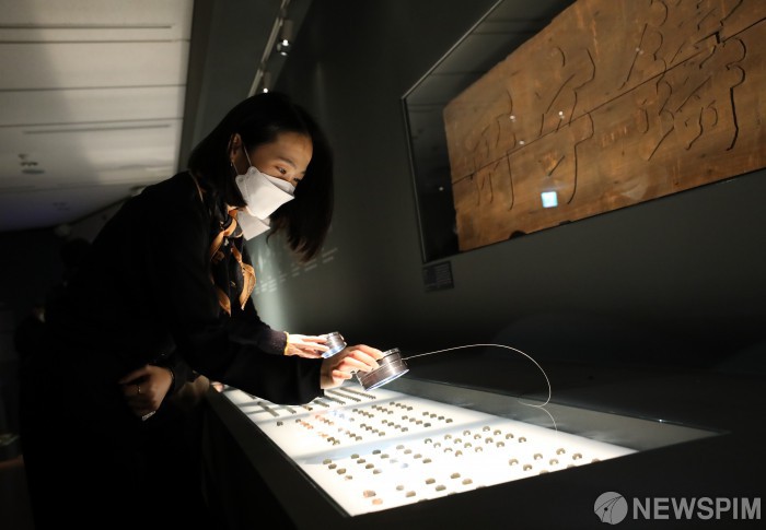 [서울=뉴스핌] 김민지 인턴기자 = 2일 오전 서울 국립고궁박물관에서 열린 '인사동 출토유물 공개전'에서 관계자가 전시된 조선 전기 금속활자를 살펴보고 있다. 이번 전시에서는 지난 6월 인사동에서 발굴한 조선 전기 금속활자, 일성정시의 등 주요 유물 1755점을 선보이며, 오는 3일부터 12월 31일까지 열린다. 2021.11.02 kimkim@newspim.com
