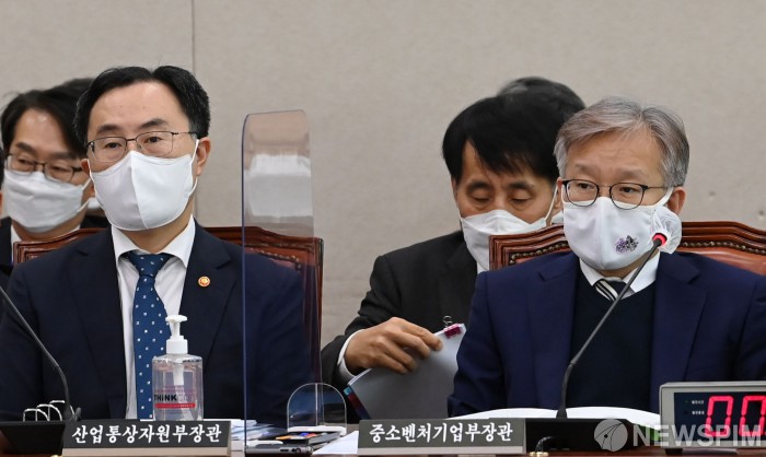 [서울=뉴스핌] 이형석 기자 = 문승욱 산업통상자원부 장관과 권칠승 중소벤처기업부 장관이 8일 서울 여의도 국회에서 열린 산업통상자원중소벤처위원회 전체회의에서 의원들의 질의를 듣고 있다. 2021.11.08 leehs@newspim.com