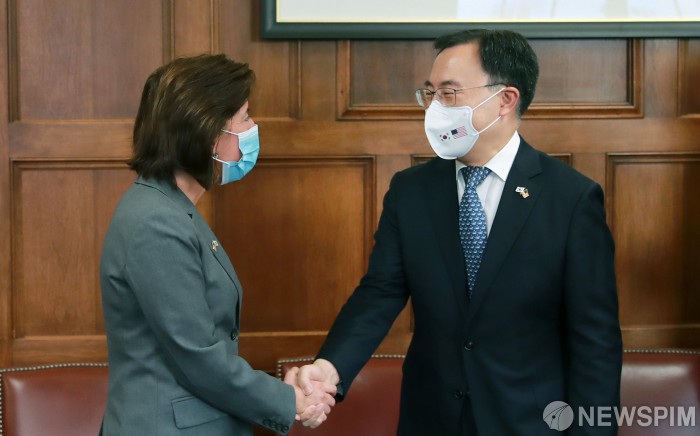[서울=뉴스핌] 문승욱 산업통상자원부 장관이 9일 오후(현지시간) 미국 워싱턴 D.C. 상무부 회의실에서 지나 레이몬도(Gina Raimondo) 미국 상무부 장관과 면담에 앞서 인사하고 있다. [사진=산업통상자원부] 2021.11.10 photo@newspim.com
