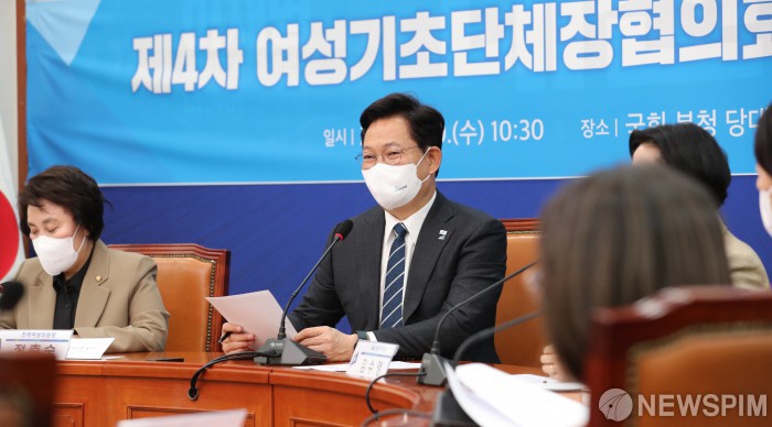 [서울=뉴스핌] 이형석 기자 = 송영길 더불어민주당 대표가 10일 서울 여의도 국회 당대표실에서 열린 제4차 여성기초단체장협의회 정책간담회에 참석해 모두발언을 하고 있다. 2021.11.10 leehs@newspim.com
