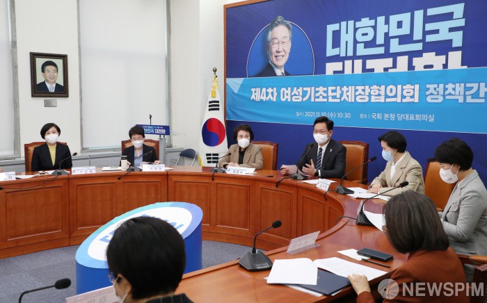 [서울=뉴스핌] 이형석 기자 = 송영길 더불어민주당 대표가 10일 서울 여의도 국회 당대표실에서 열린 제4차 여성기초단체장협의회 정책간담회에 참석해 모두발언을 하고 있다. 2021.11.10 leehs@newspim.com
