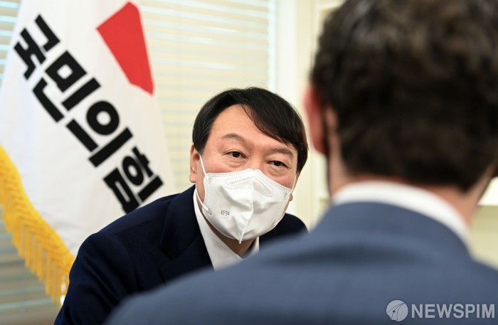[서울=뉴스핌] 최상수 기자 = 윤석열 국민의힘 대선 후보가 12일 오전 서울 여의도 중앙당사에서 존 오소프 미 상원의원을 접견하고 있다. 2021.11.12 kilroy023@newspim.com